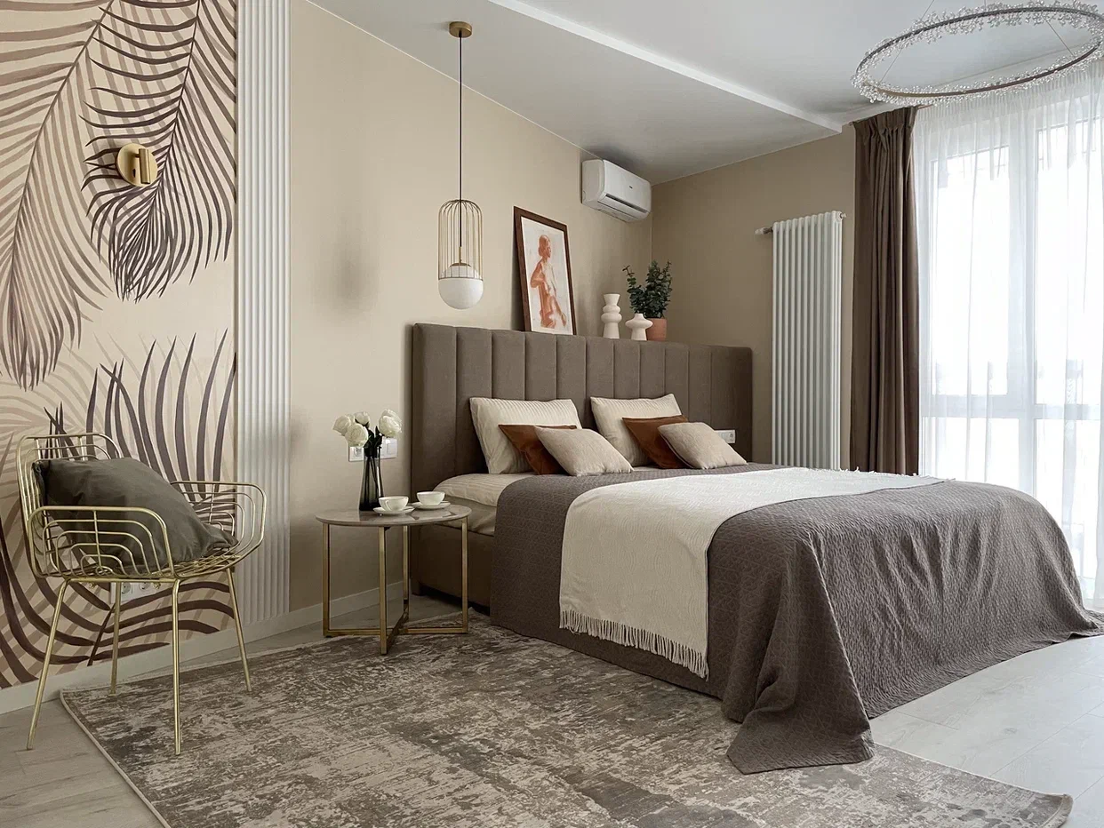 Акцент цвета в мебели мы поддержали текстилем в шторах, натуральные оттенки, фактура и декор создают гармоничный ансамбль в спальне.