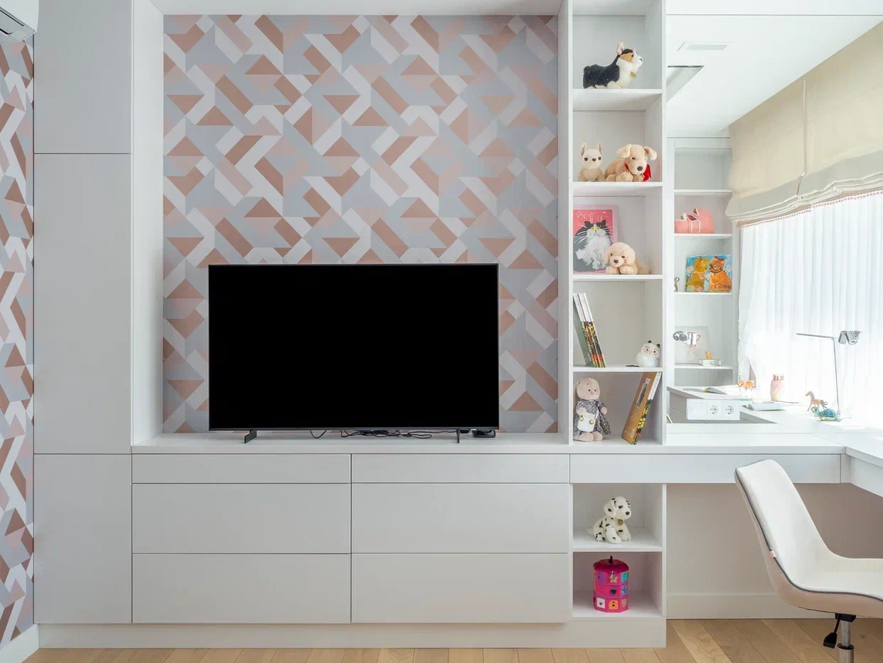 Римские шторы в рабочей зоне у стола, с использованием декоративной тесьмы в цвет акцентной стены в интерьере и мягкий струящийся тюль на подхватах, декорированные тесьмой, как дополнительное управление световым потоком.