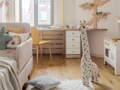 Наша любимая римская штора в рабочей зоне — всегда светло и функционально. Для ребенка легко в управлении, а нежный оттенок в ткани поддерживает изголовье детской кроватки. Тема лесной сказки раскрыта.