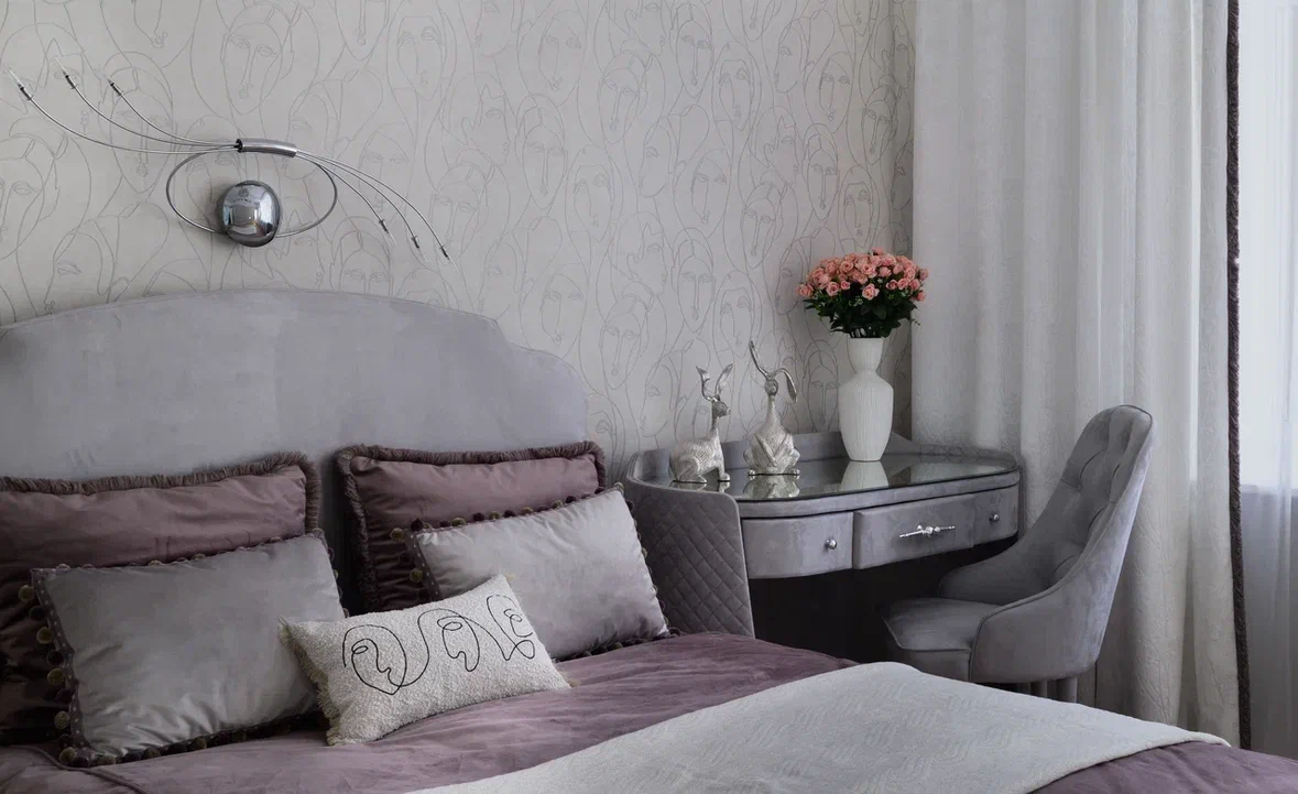 Успокаивающий интерьер в спальне — отличное решение для любого интерьера. Мы добавили акцент в декоре. Тесьма в шторах и подушках и легкий принт в шторах удачно подчеркивают стену в зоне у изголовья кровати.