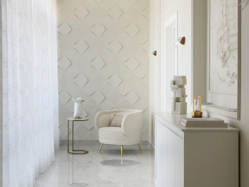 Слегка заметный принт в тюле "гусиная лапка" придает интерьеру изюминку и воздушность. Благодаря хорошей сборке мы смогли отказаться от плотных штор, в данной зоне появилось много света.