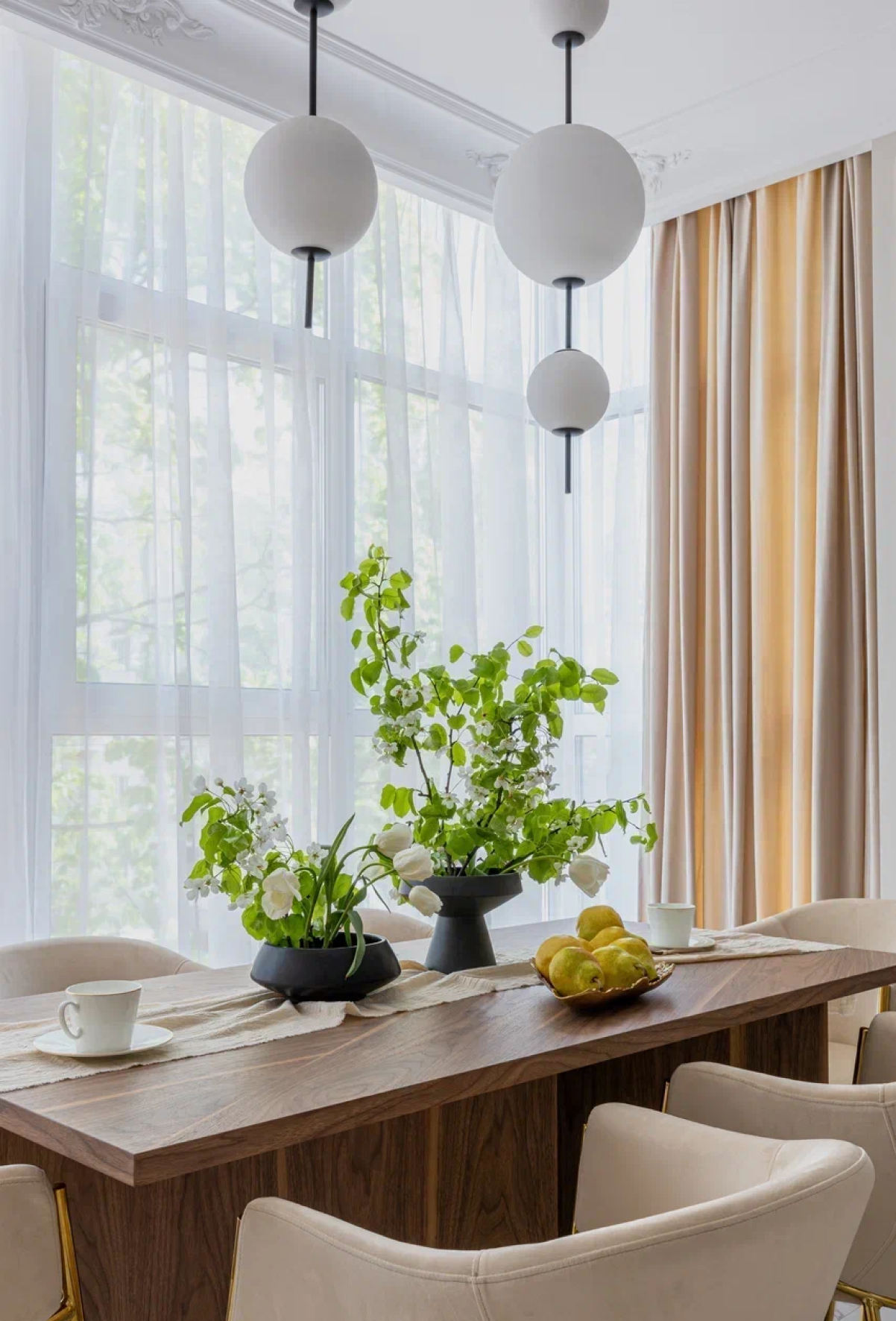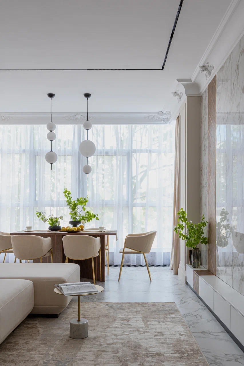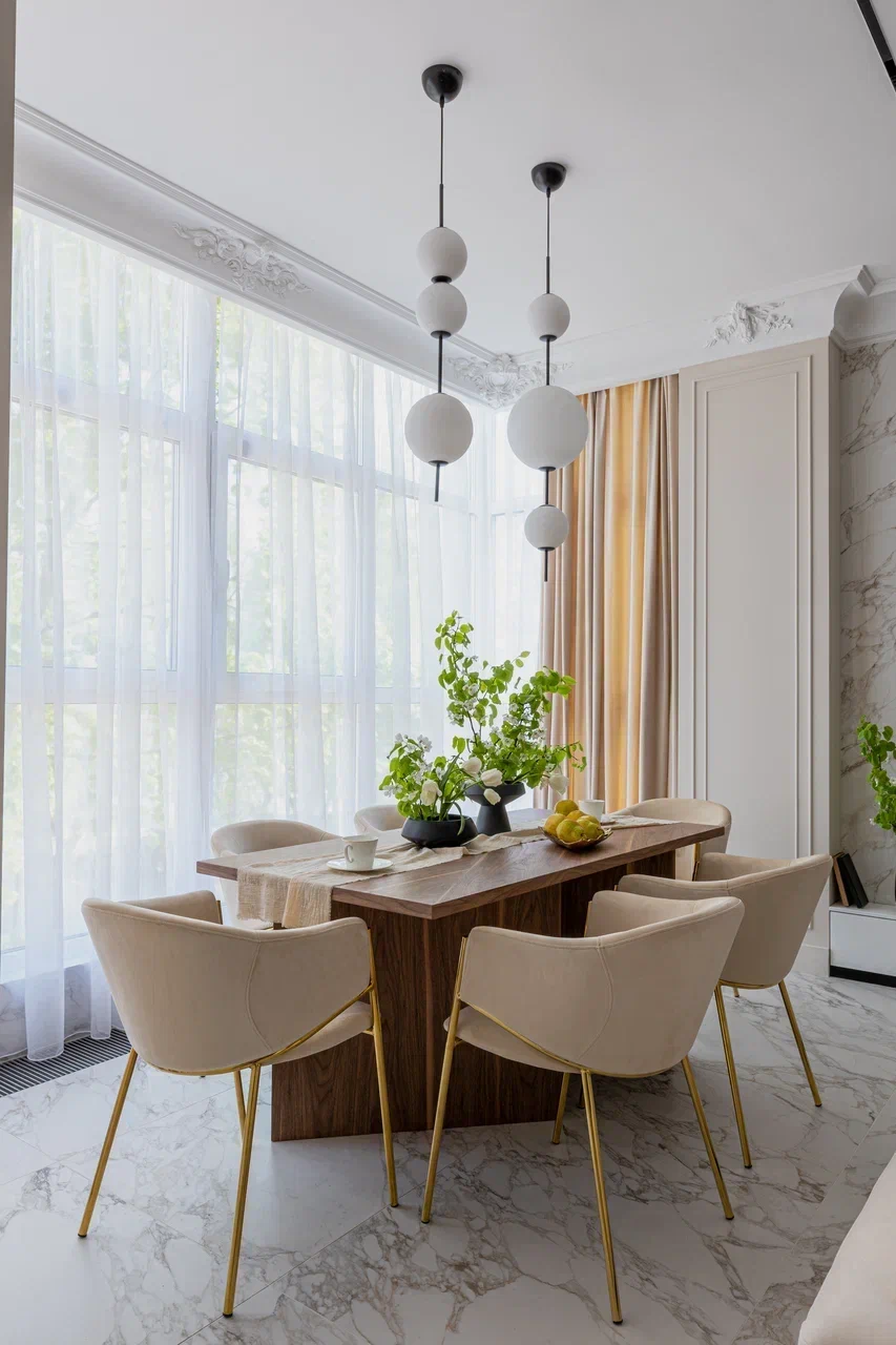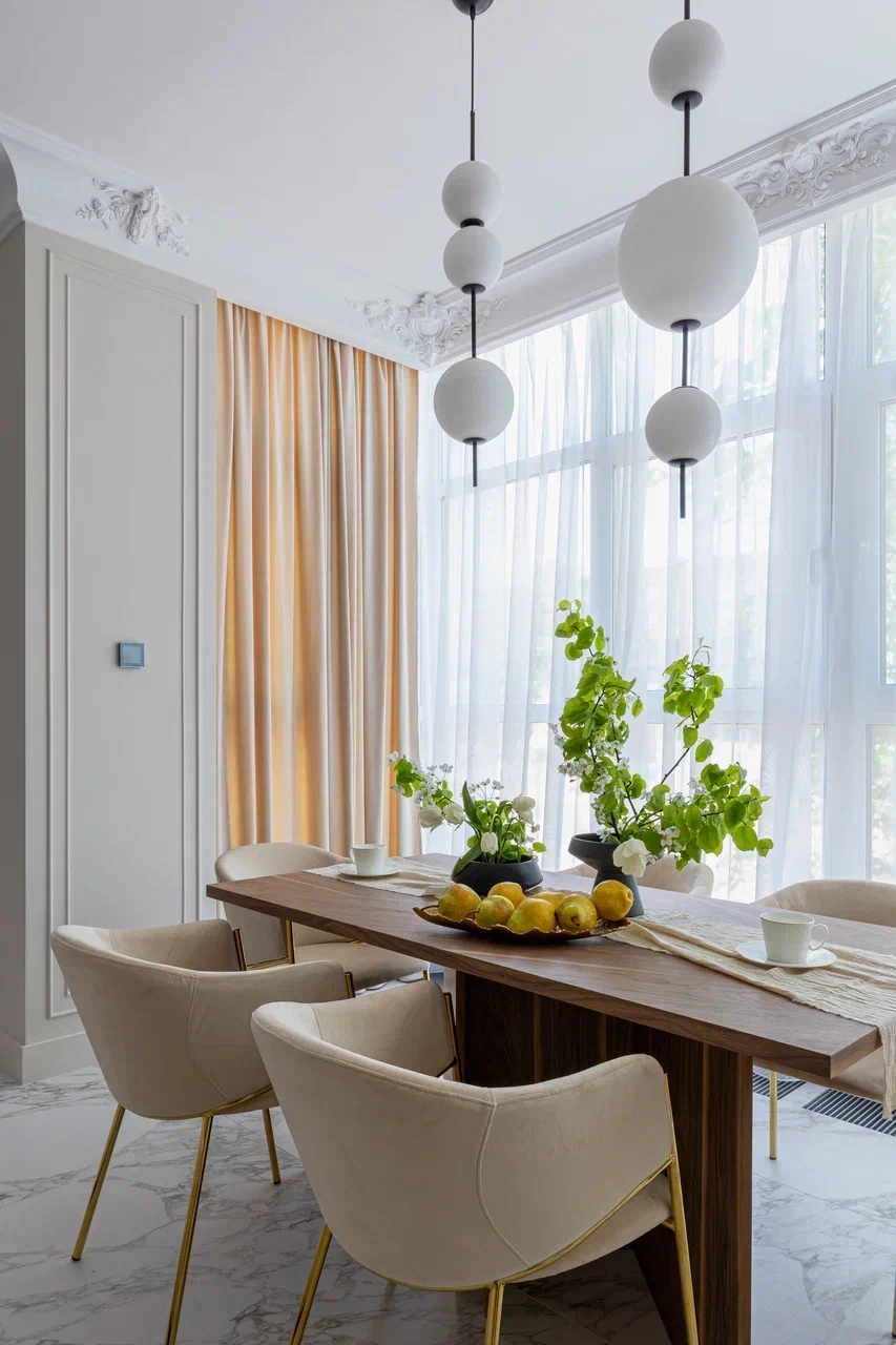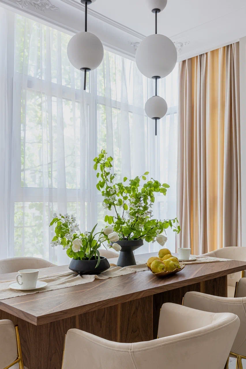 Минимализм и лаконичность — то, чего мы хотели добиться в этом интерьере. Классический вариант тюля, в меру прозрачный и приятный тактильно, всегда освежает интерьер и добавляет ему лёгкого шарма, а правильна сборка визуально обогащает пространство и придаёт воздушности помещению.