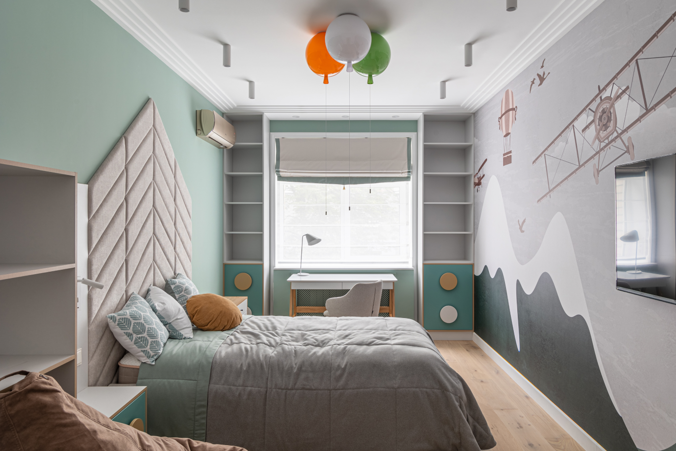 Текстиль в этой комнате является продолжением всего интерьера. Обтачка из контрастной ткани в цвет стен на римской шторе повторяет декор в покрывале, вся комната выполнена в едином ансамбле.