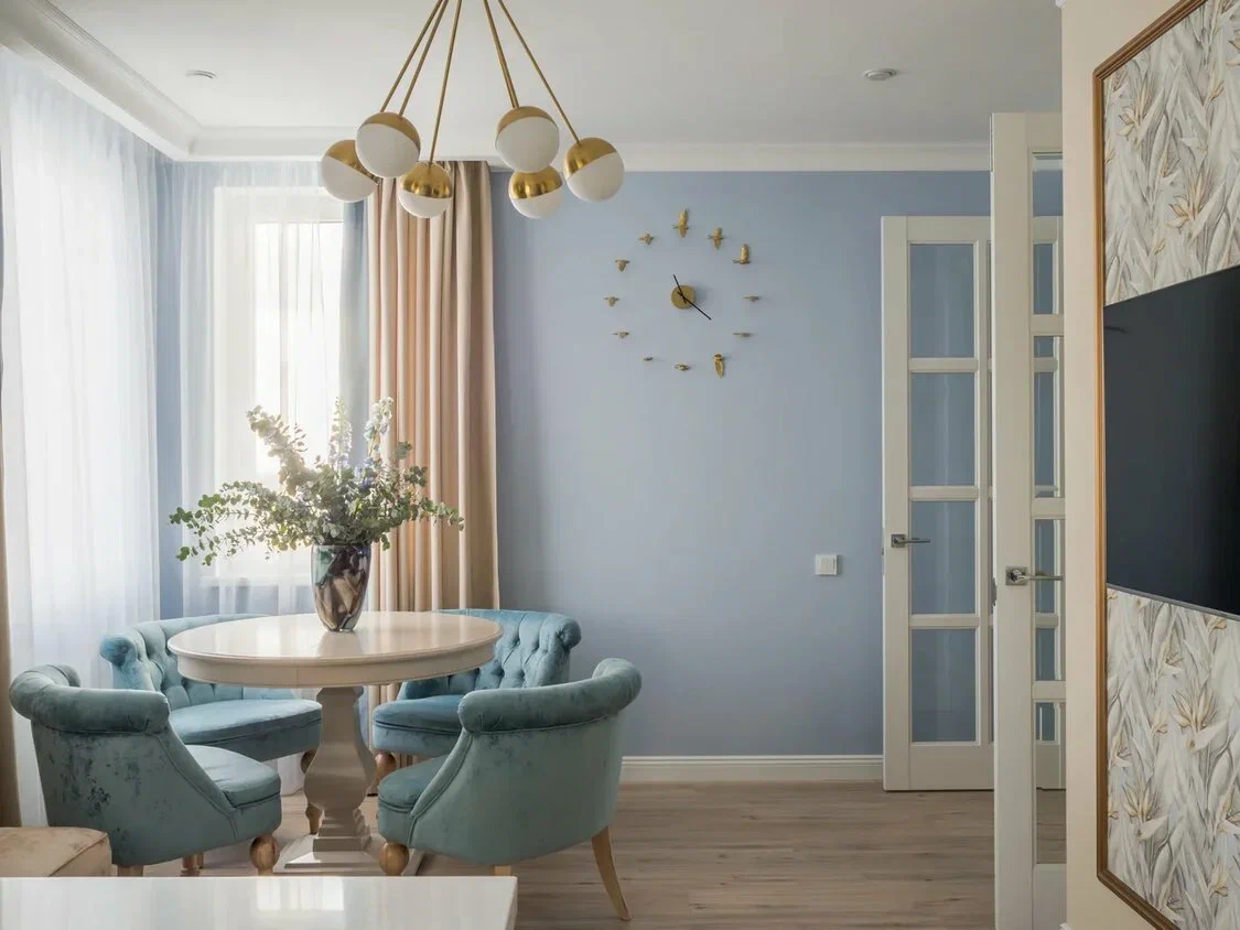 Игра контрастов — бежевые шторы на фоне голубых стен и поддерживающий голубой кант в цвет. Добились идеального совпадения цвета мебели и основной ткани в шторах. Когда небольшой декор в текстиле играет важную роль во всем интерьере.