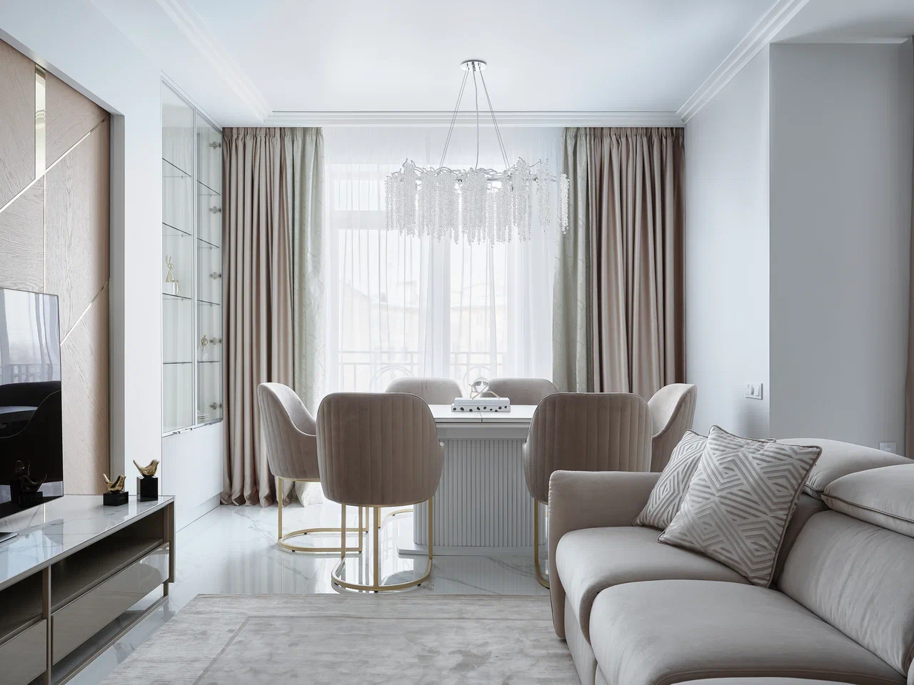 Утонченная, современная классика с использованием атласа в текстиле и боковая обтачка, поддерживающая мрамор в гостиной, цвет штор максимально сочетается с цветом мебели объединяя их в единый ансамбль.