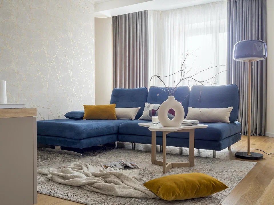 Нейтральный оттенок в шторах, велюр и его струящиеся складки, шторы — продолжение интерьера, а акцентом и центральной точкой служит диван — главное место в гостиной!