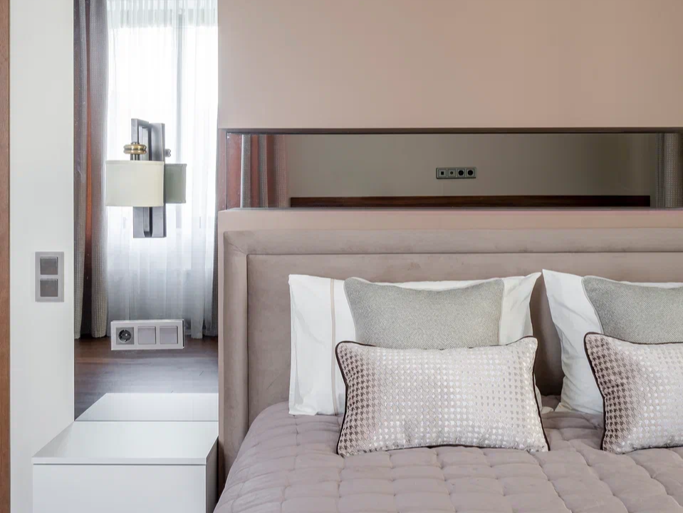 В шторах использован мелкий принт "гусиная лапка" на бархатной основе, поддержали его в декоративных подушках для объединения ансамбля.