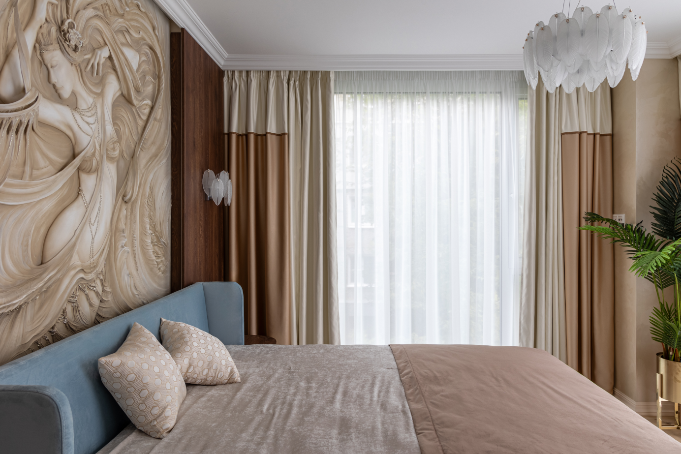 Основной задачей было поддержать фреску у изголовья кровати. В шторах мы сочетаем атлас нескольких оттенков, подчеркнув декоративной тесьмой. Покрывало также разделили на две цветовые зоны.